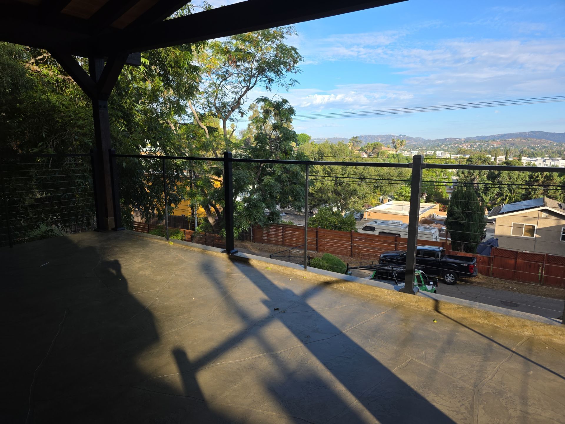 View from a balcony overlooking a residential street and hills, with a green truck visible.